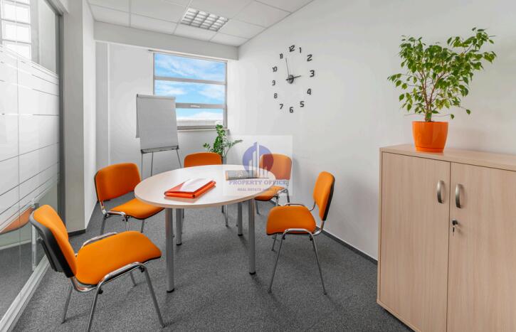 Powierzchnia w pełni wyposażona w biurka, fotele i szafy na dokumenty.