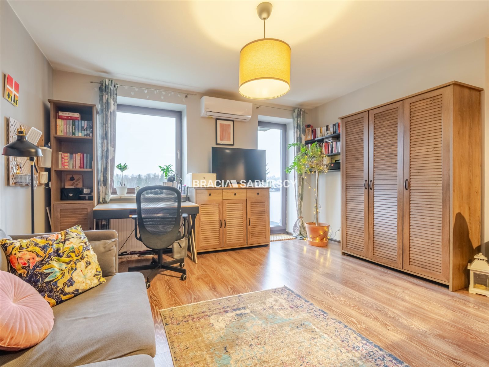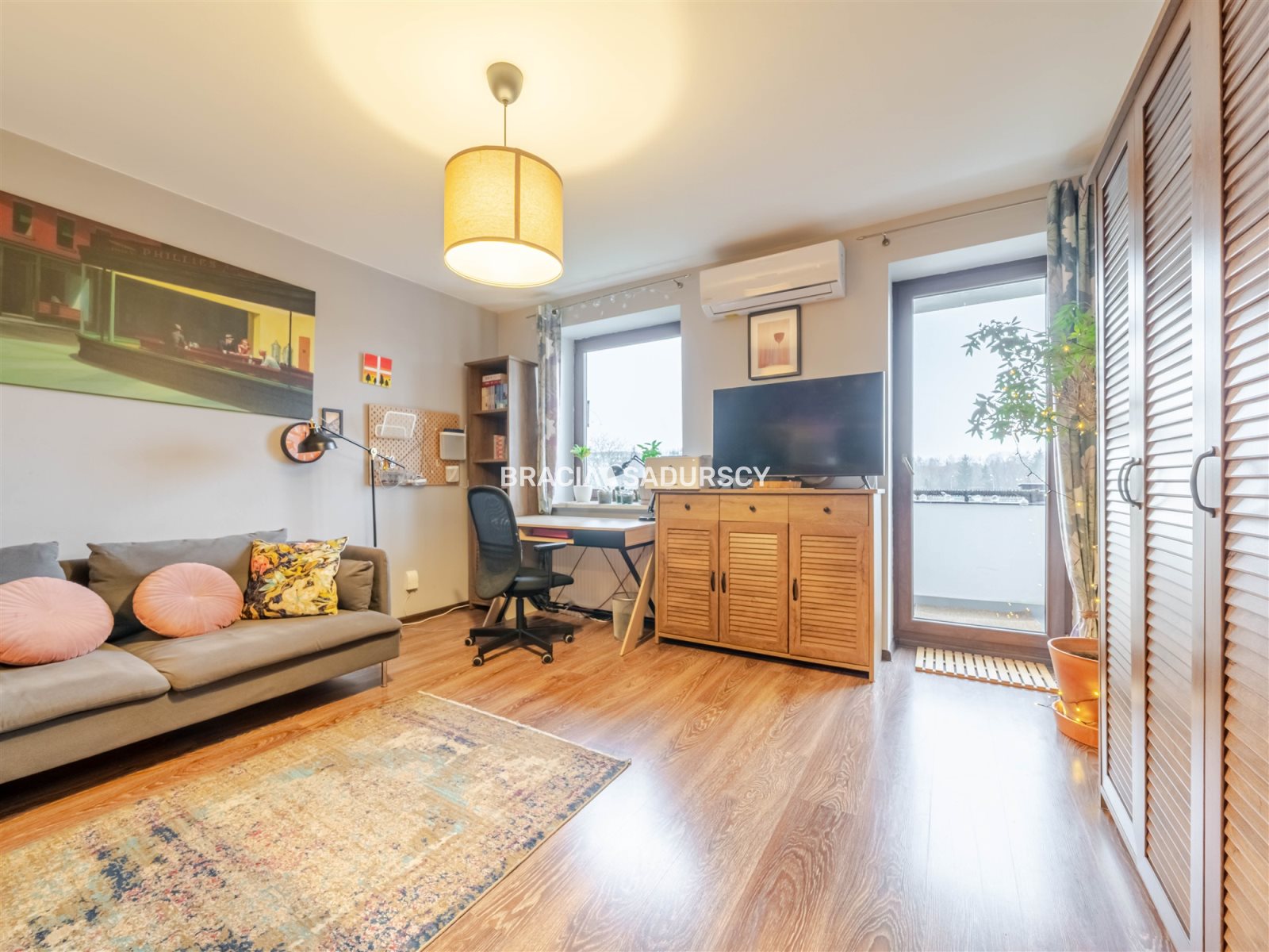 W dużym pokoju jest zamontowana klimatyzacja.