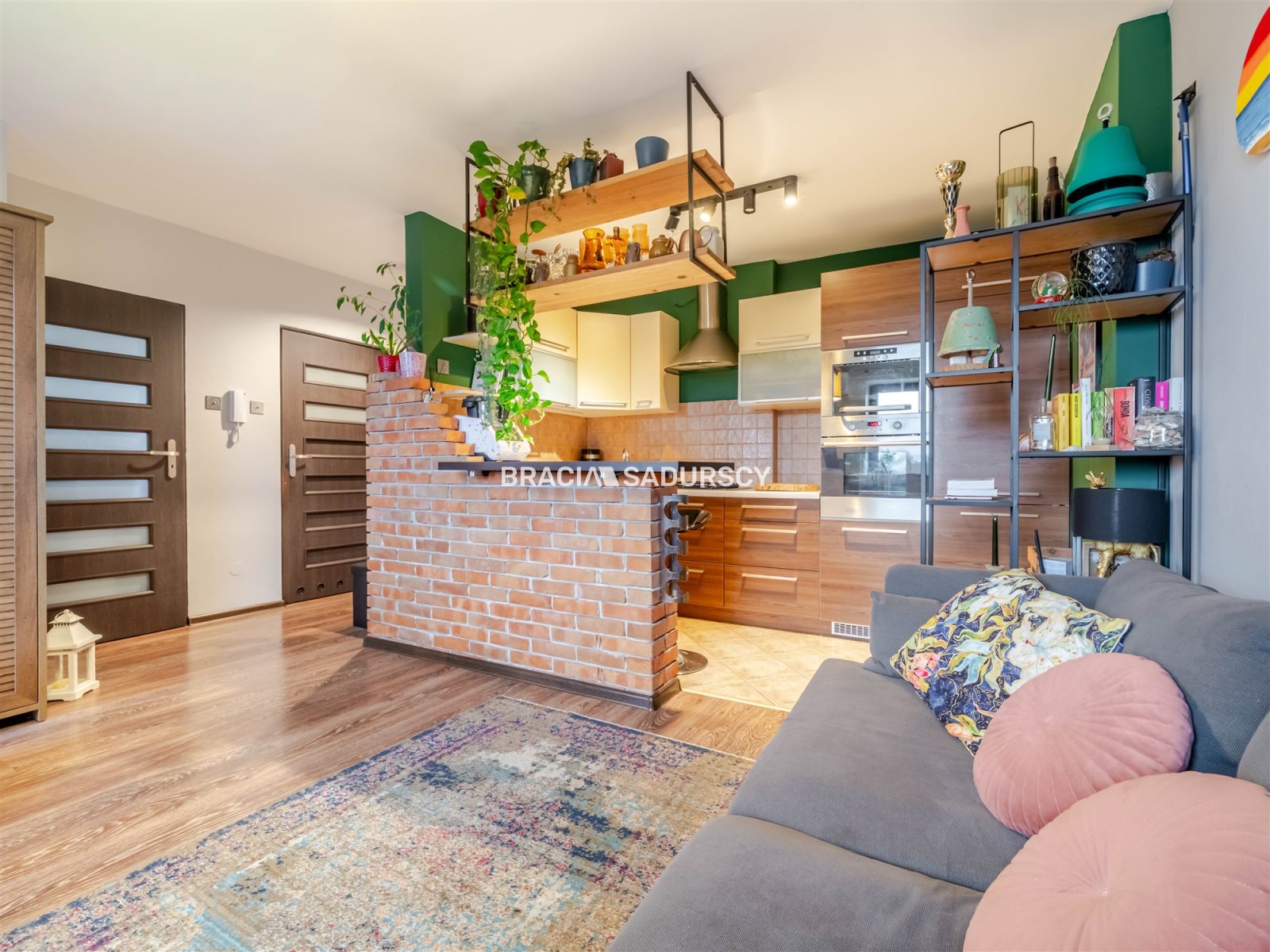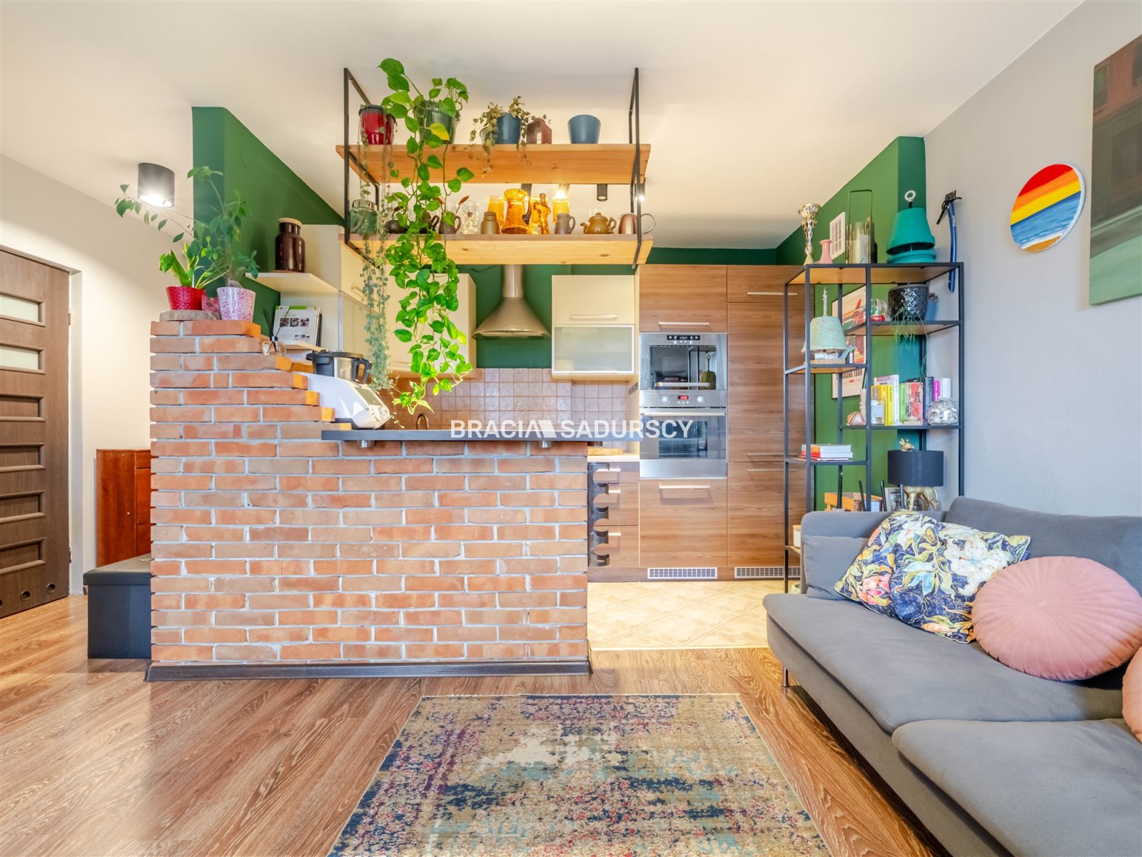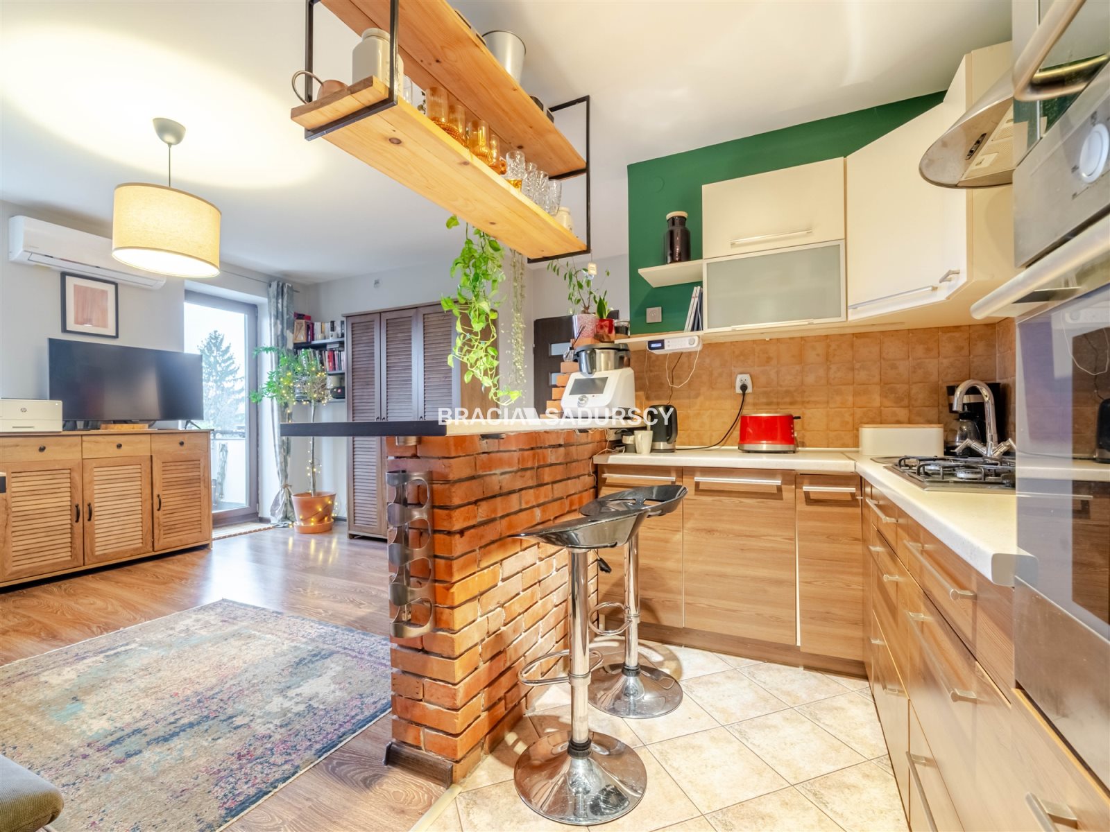 - kuchnia (ok. 6 m2) otwarta na pokój, oddzielona częściowo klimatyczną ścianką z cegły,