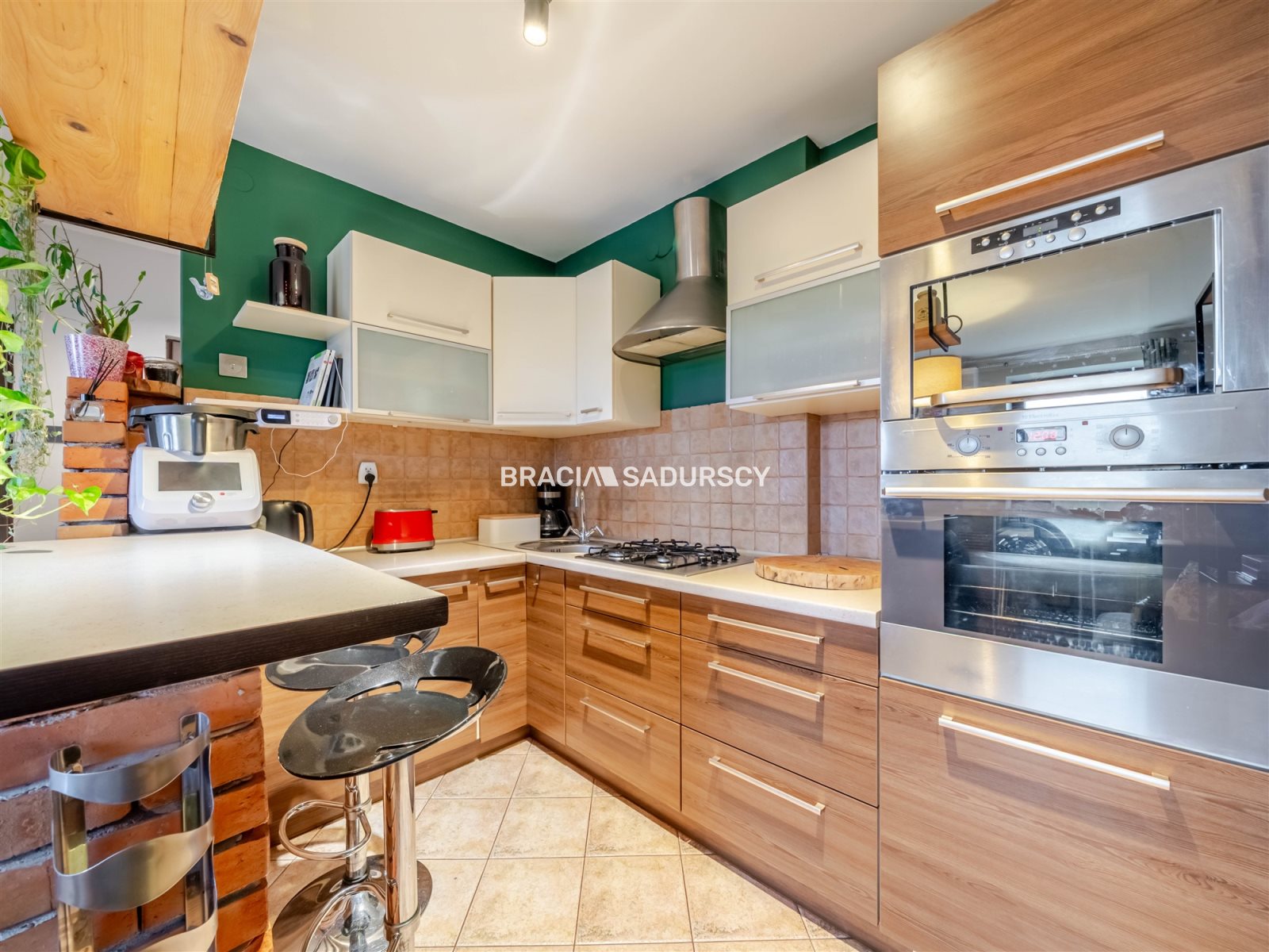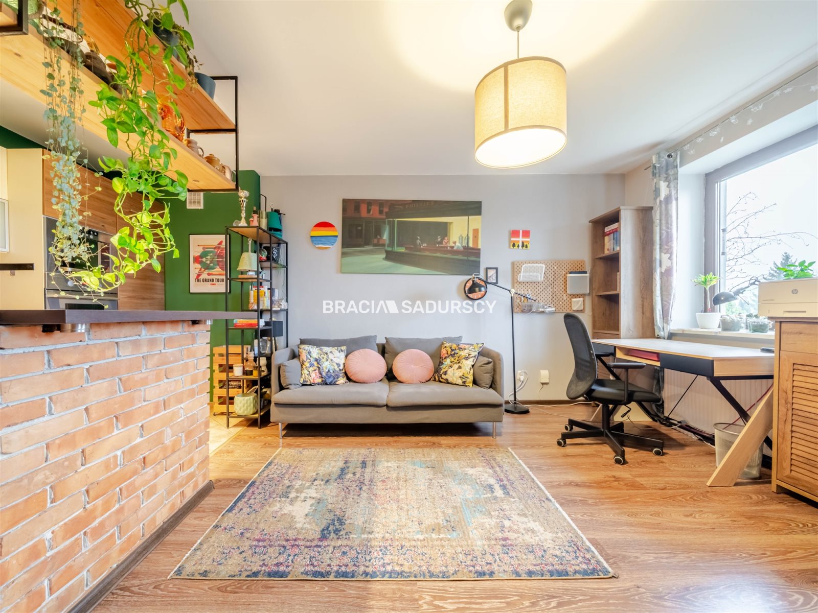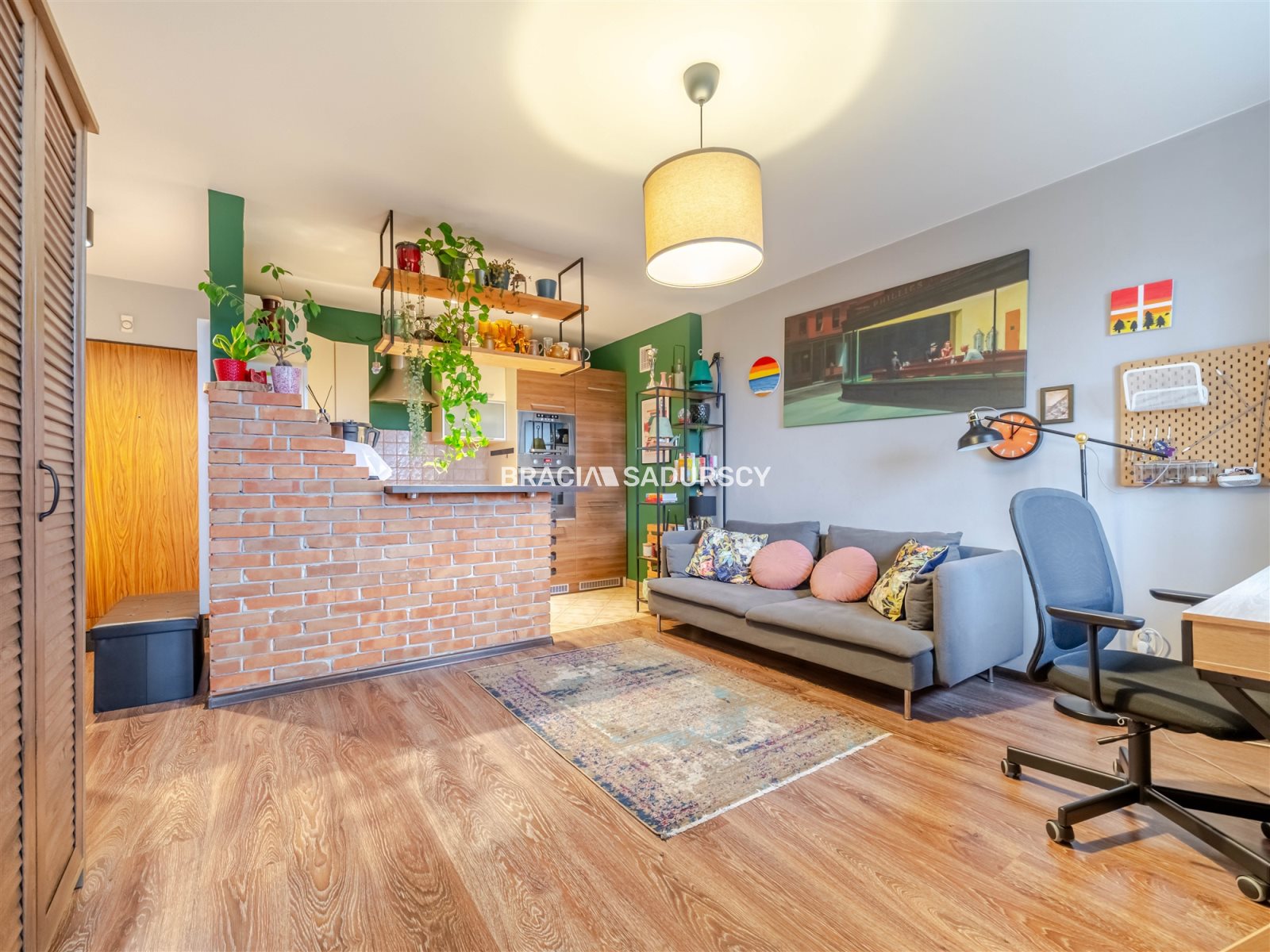 - kuchnia (ok. 6 m2) otwarta na pokój, oddzielona częściowo klimatyczną ścianką z cegły,