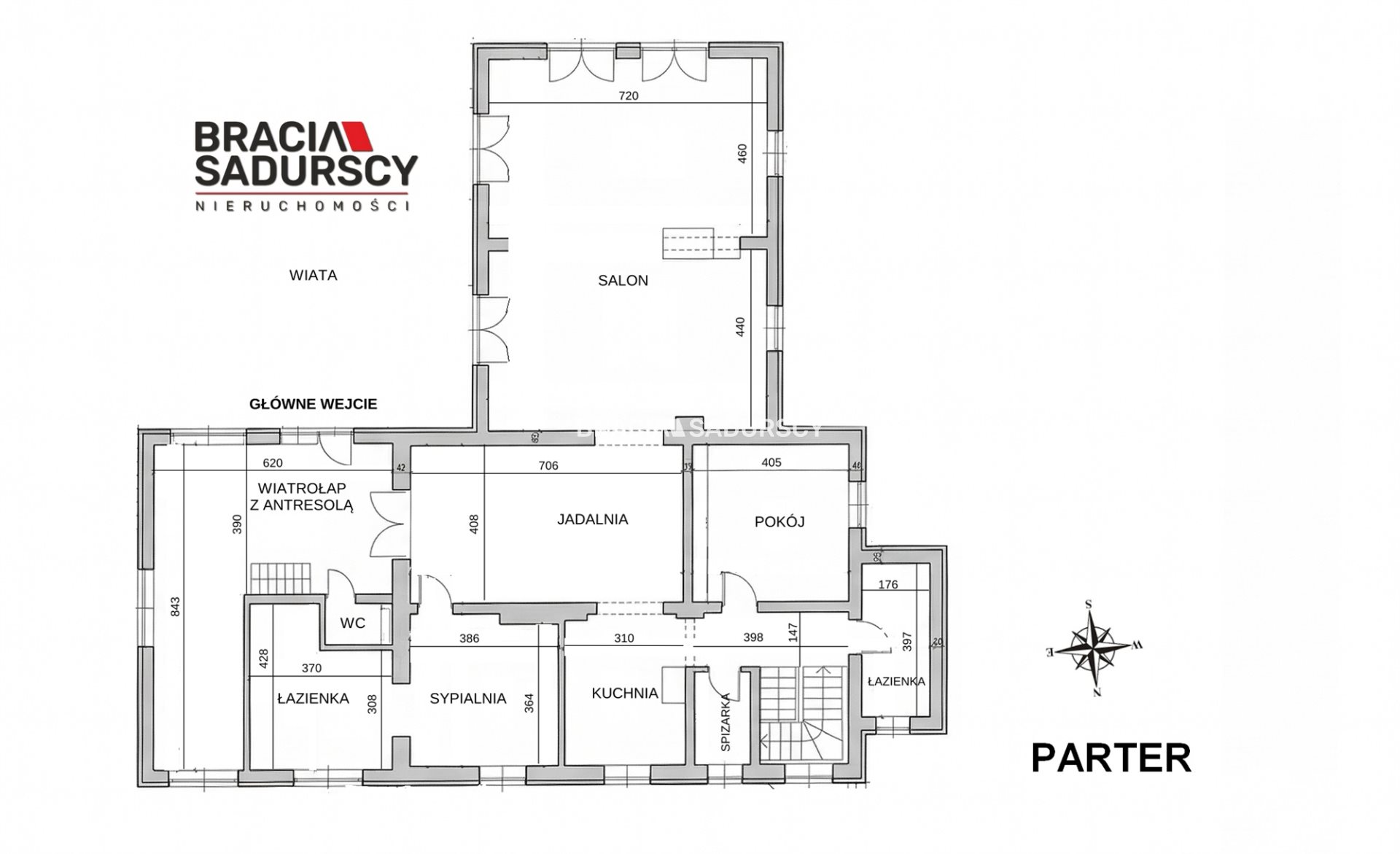 Parter (217,70 m²): duży salon 68,40 m², dwa pokoje (16 m² i 14 m²), kuchnia, jadalnia, 2 łazienki i WC, możliwość adaptacji wnętrz pod potrzeby reprezentacyjne lub rekreacyjne.