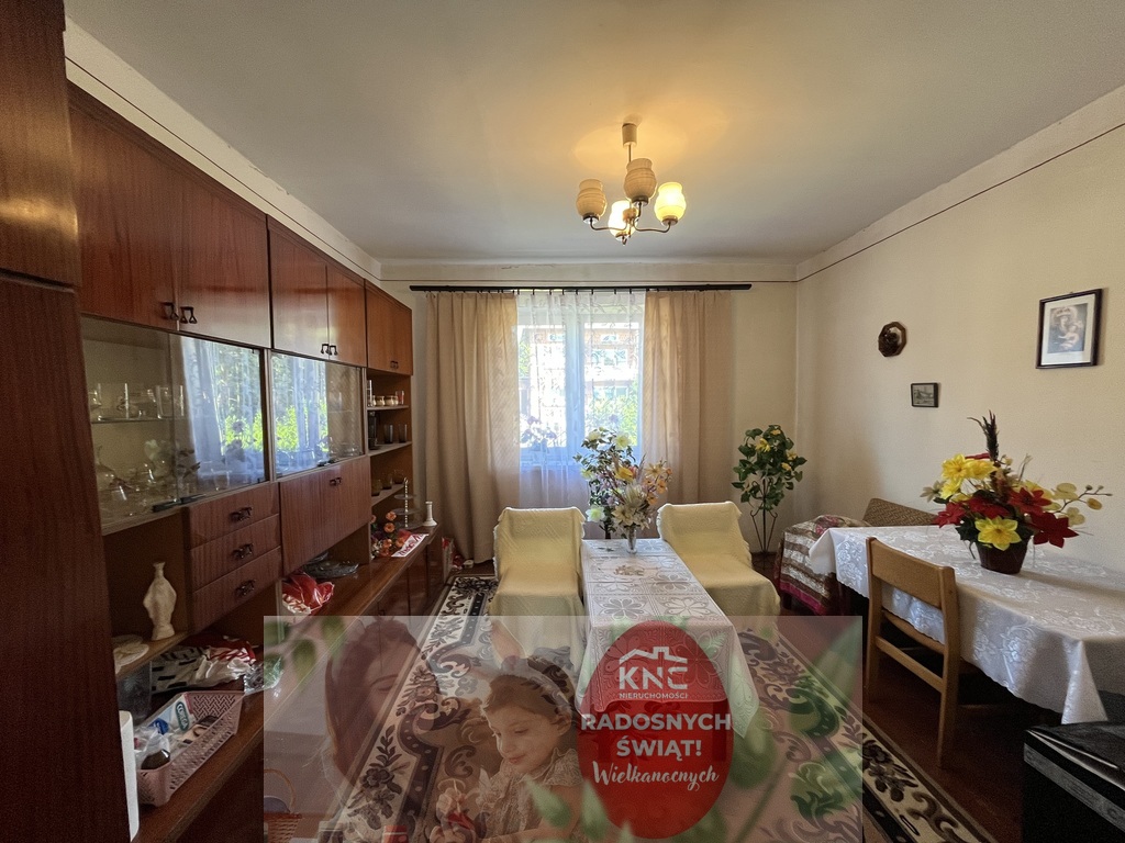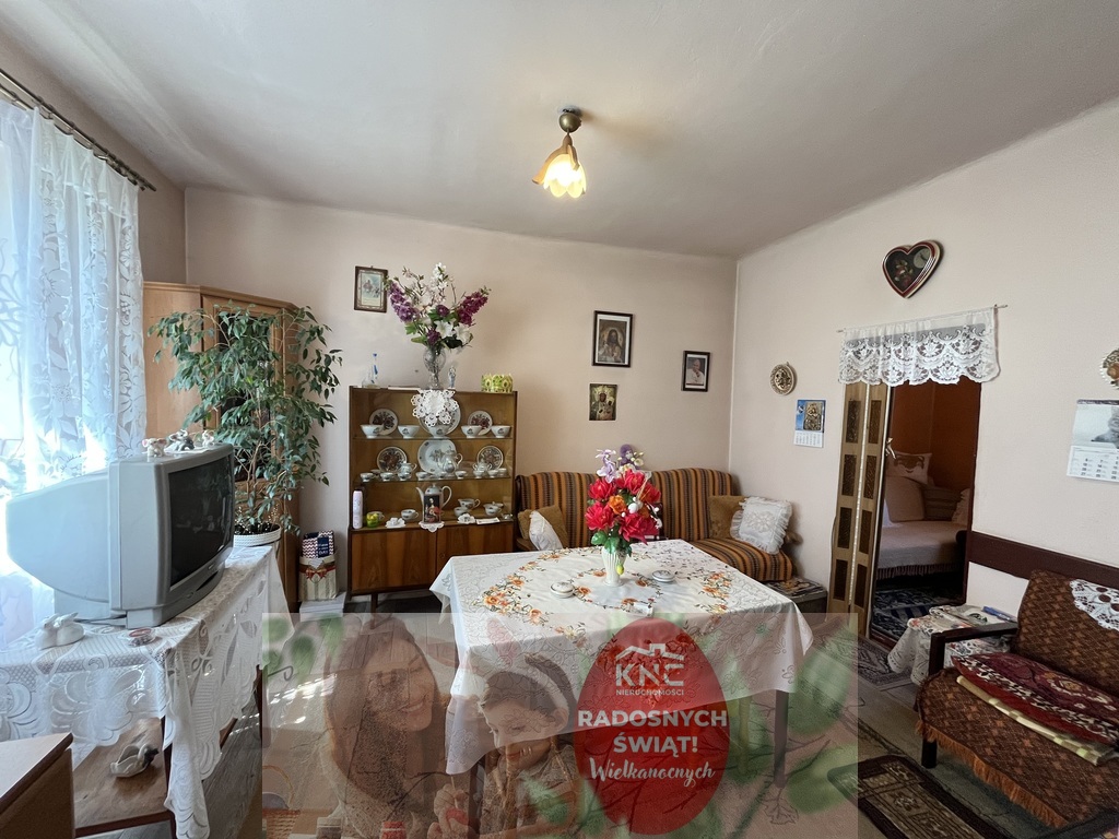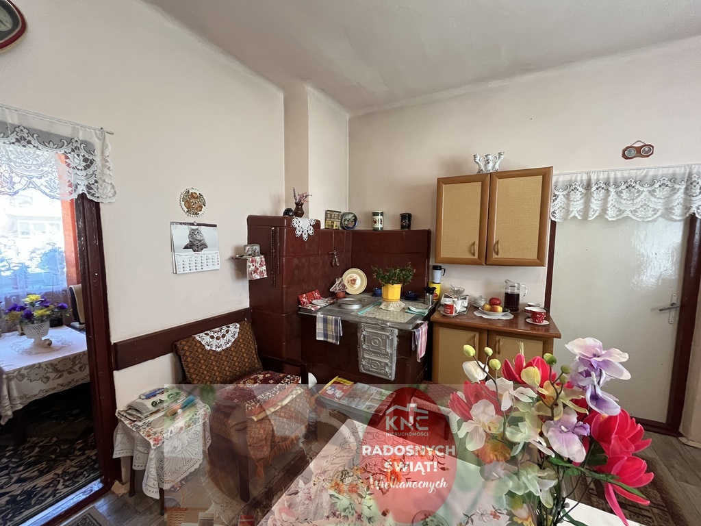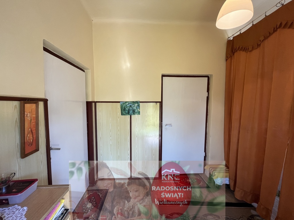 -dom składa się z przedsionka o pow. 7 m2, pokoju z kuchnia kaflowa (można dostosować jako pomieszczenie kuchni) o pow. 16 m2, drugiego pokoju o pow. 16 m2 oraz trzeciego pokoju o pow. 9,5 m2. Podłogi w części budynku drewniane z desek w części wylewki pokryte linoleum. Okna plastikowe. Budynek w dobrym stanie.