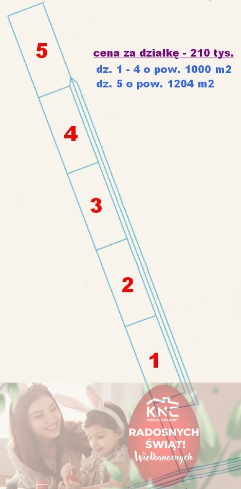 - działki nr 1-4 : powierzchnia pow. 1000 m²; wym. szer. 20m x dł. 50 m - cena 210 000 zł.