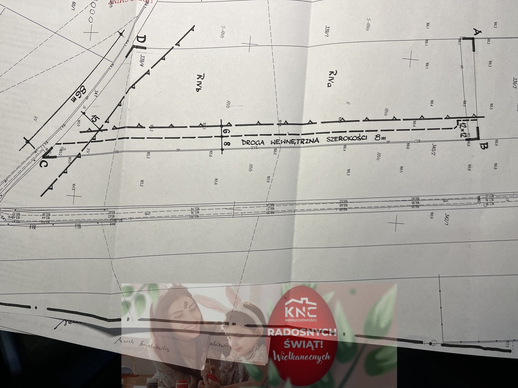 - działka ma kształt trapezu. jej szerokość to 68,5 m i długość średnio 260 m. Od prawej granicy działki wydzielono drogę o szerokości 8 m do której kolejno przylega osiem wytyczonych z podziału osobnych działek budowlanych.