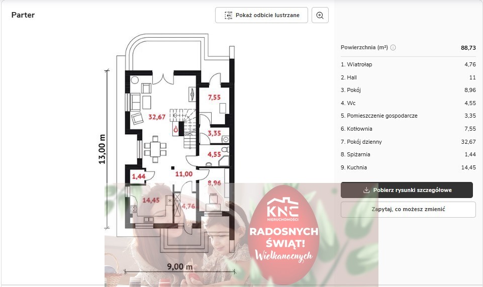 Powierzchnia (m²) parteru 88,73