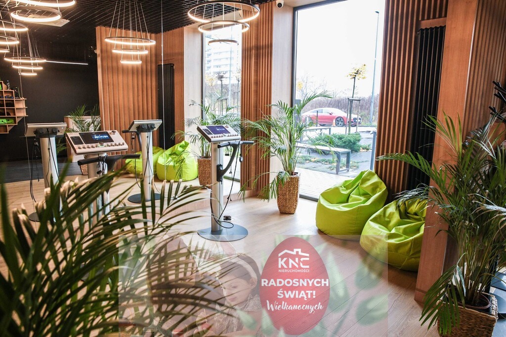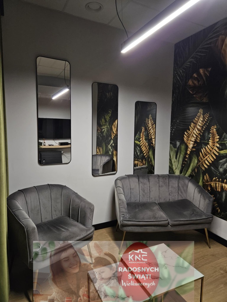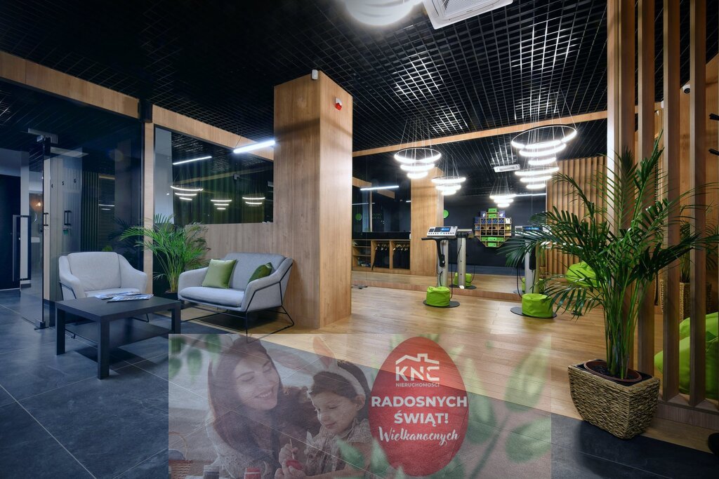 Sufity podwieszane o ażurowym designie oraz nowoczesne oświetlenie tworzą przytulną i funkcjonalną przestrzeń, idealną do prowadzenia różnorodnych działalności.